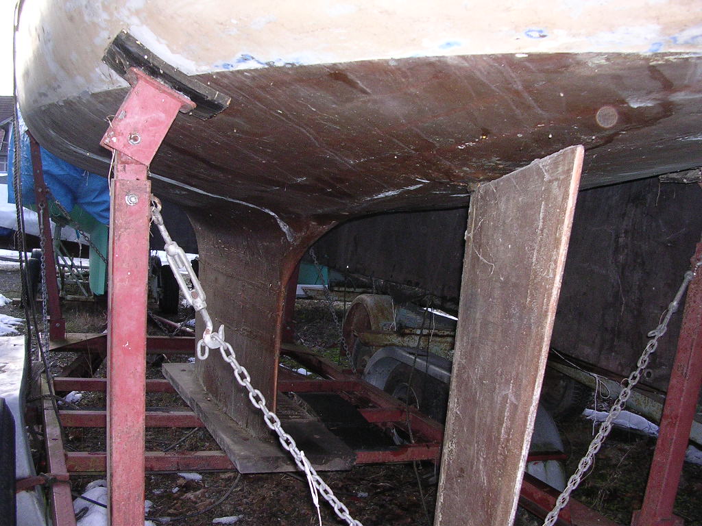 Ich habe noch ein weiterer ungeklärter fall im garten stehen. Das schiff soll laut zolldokumenten bj 1912 und deutschen ursprungs sein. Die masse sind wie folgt: lüa 6.85m warscheinlich etwas abgeschnitten, büa1.81m ,tg 1.10m grösstes freibord 35cm. Der kiel aus blei 420 kg ist mit dem totholz untergebolzt also U spant. Kiel und ruder sind getrennt und es gibt auch keine anzeichen das es einmal anders war. Im grosssegel steht ein E und auf einem anderen ein S.