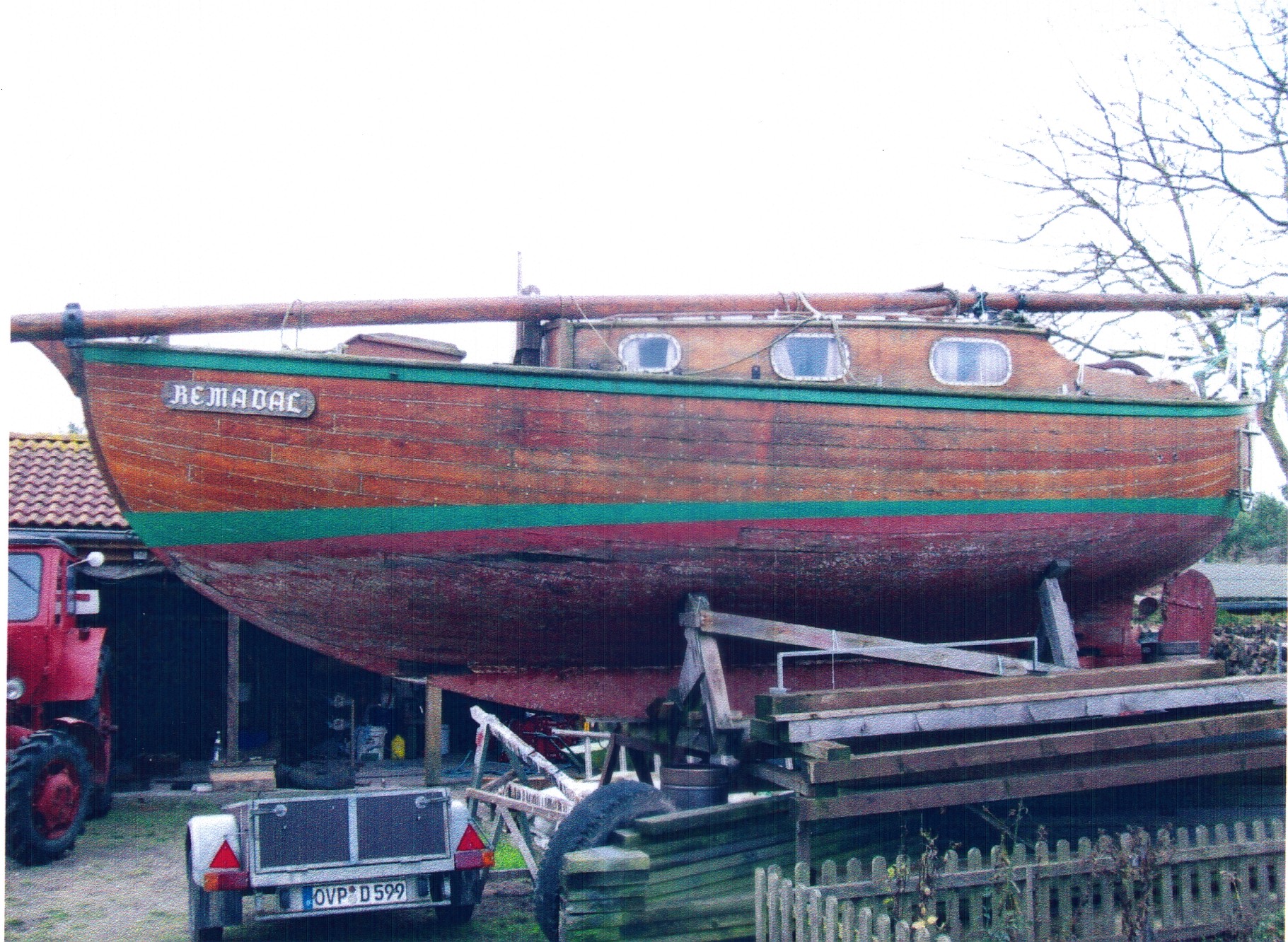 eine befreundete Familie hat eine Hillyard Yacht erworben, die nun etwas mitgenommen, vermutlich durch Eisgang auf dem Hof steht.