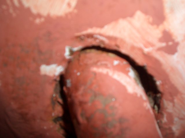 Wie man hoffentlich aus dem angehängten Bild sehen kann, befürchte ich ganz stark, dass der Übergang vom Ruderschaft zum GFK am Achtersteven, als da wo die Ruderwelle austritt, undicht ist.